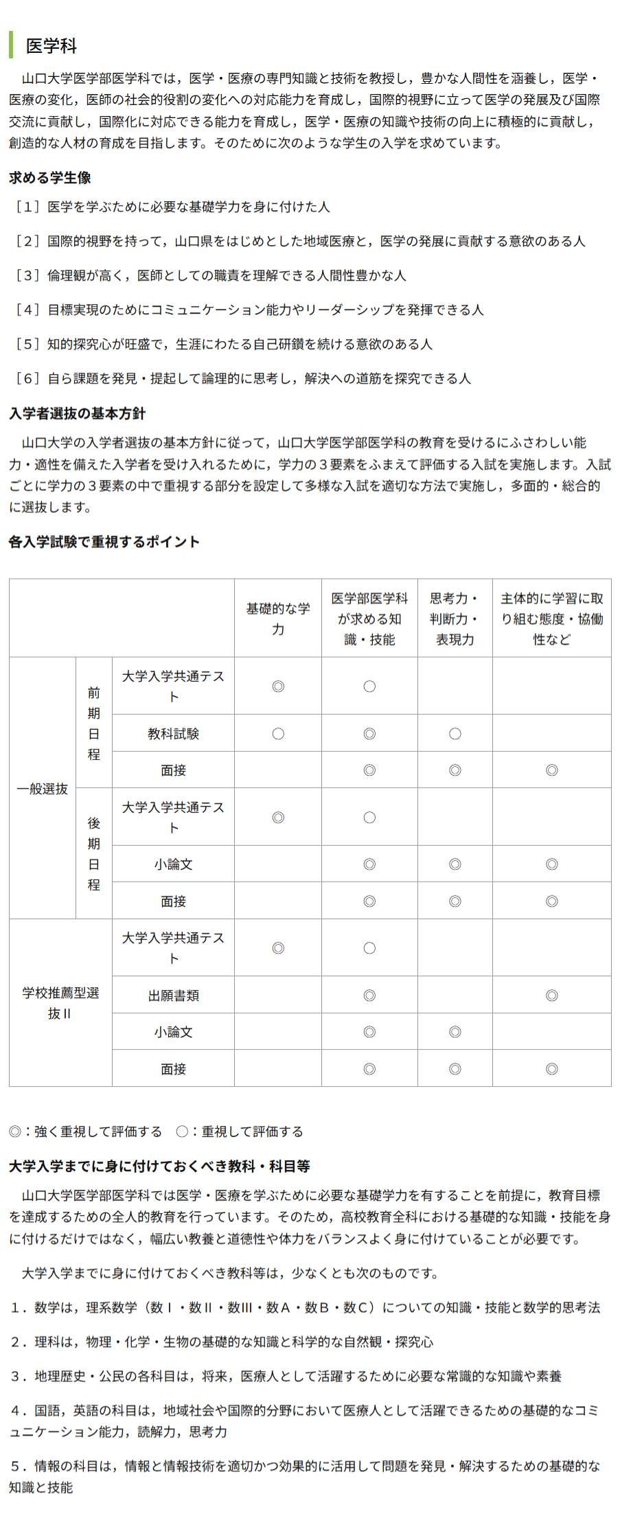 | 出願資格 | 〈全国枠〉 現役生【専願】 調査書の学習成績の状況がAに属する者 共通テストを課す 他 〈地域枠〉 上記に加え、山口県内の高校を卒業見込みの者、もしくは県外の高校を卒業見込みの者のうち、出願時において山口県内に3年以上継続して在住する保護者等を有する者 卒業後、医師免許を取得し、直ちに山口県内の病院で臨床研修(2年間)を受け、修了後引き続き4年以上、山口大学医学部及び附属病院を含む県内の医療機関又はその関連施設で医学・医療の研究等の発展や地域医療に貢献することが確約できる者 他 〈特別枠〉(緊急医師確保対策枠、地域医療再生枠) 現役生 1浪生・2浪生【専願】 共通テストを課す 山口県内の高校を卒業見込みの者、もしくは県外の高校を卒業見込みの者のうち、出願時において山口県内に3年以上継続して在住する保護者等を有する者 卒業後、医師免許を取得し、直ちに山口県内の病院で臨床研修(2年間)を受け、修了後から12年以内に7年以上(臨床研修と合わせて合計9年)、山口大学医学部附属病院を含む山口県内の医療機関等において、医療の発展や地域医療に貢献することが確約できる者 山口県から「山口県医師修学資金(緊急医師確保対策枠)」を受給することが確約できる者 他 (重点医師確保対策枠)については、学生募集要項で要確認。 *詳細は必ず大学HPでご確認ください。 |