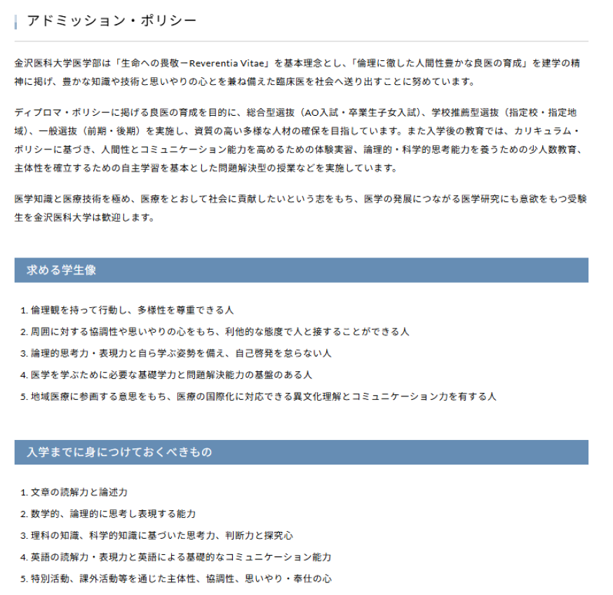| 推薦条件 | 25歳以下【専願】 高等学校を卒業、卒業見込みの者、またはそれと同等以上の学力があると認めた者 本学卒業後、本学病院または氷見市民病院、もしくは指定の臨床研修指定病院において臨床研修(5年間)を行うことを確約できる者 他 *詳細は必ず大学HPでご確認ください。 |