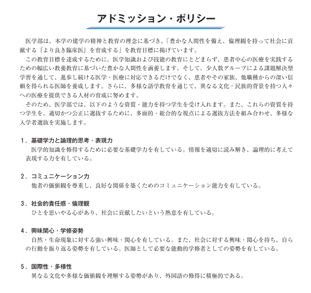 | 出願資格 | 現役生・1浪生【専願】 全体の学習成績の状況が3.8以上で、数学・理科のそれぞれの学習成績の状況が4.0以上 他 ※詳細は必ず大学HPでご確認ください。 |