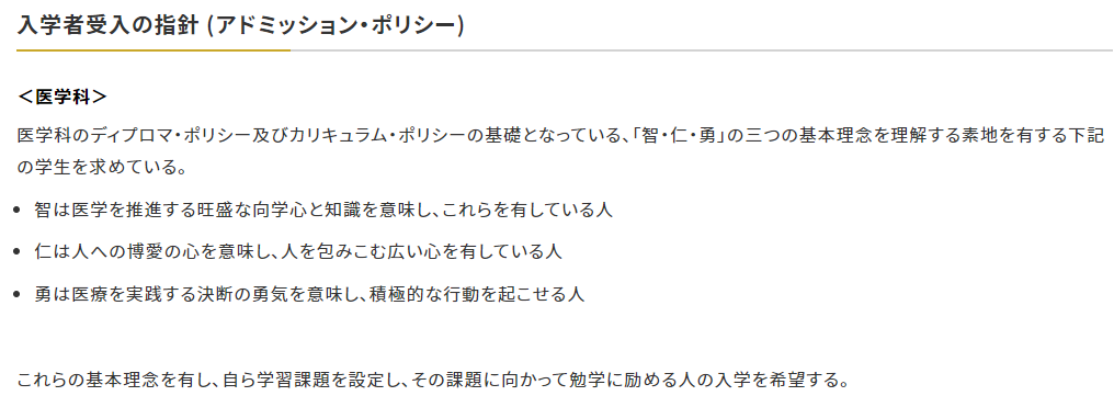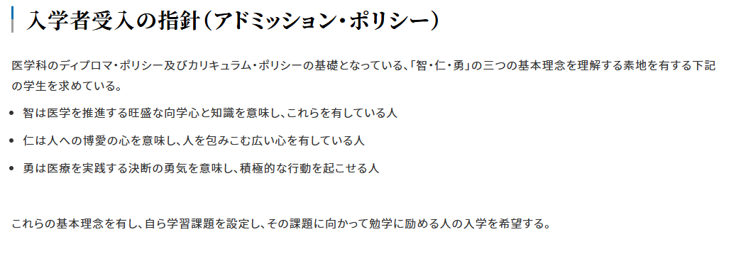 | 面接=一般的態度・発言内容・コミュニケーション能力等の評価を通じて、医師・医学研究者としての適性を判断 | ー |